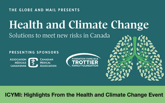 On Monday, October 6, The Globe and Mail hosted Health and Climate Change, presented by the Canadian Medical Association (CMA) and Trottier Family Foundation. The event brought together care providers and consumers, community and sustainability leaders to share actions for healthier people and a healthier planet. Click here for the highlights.