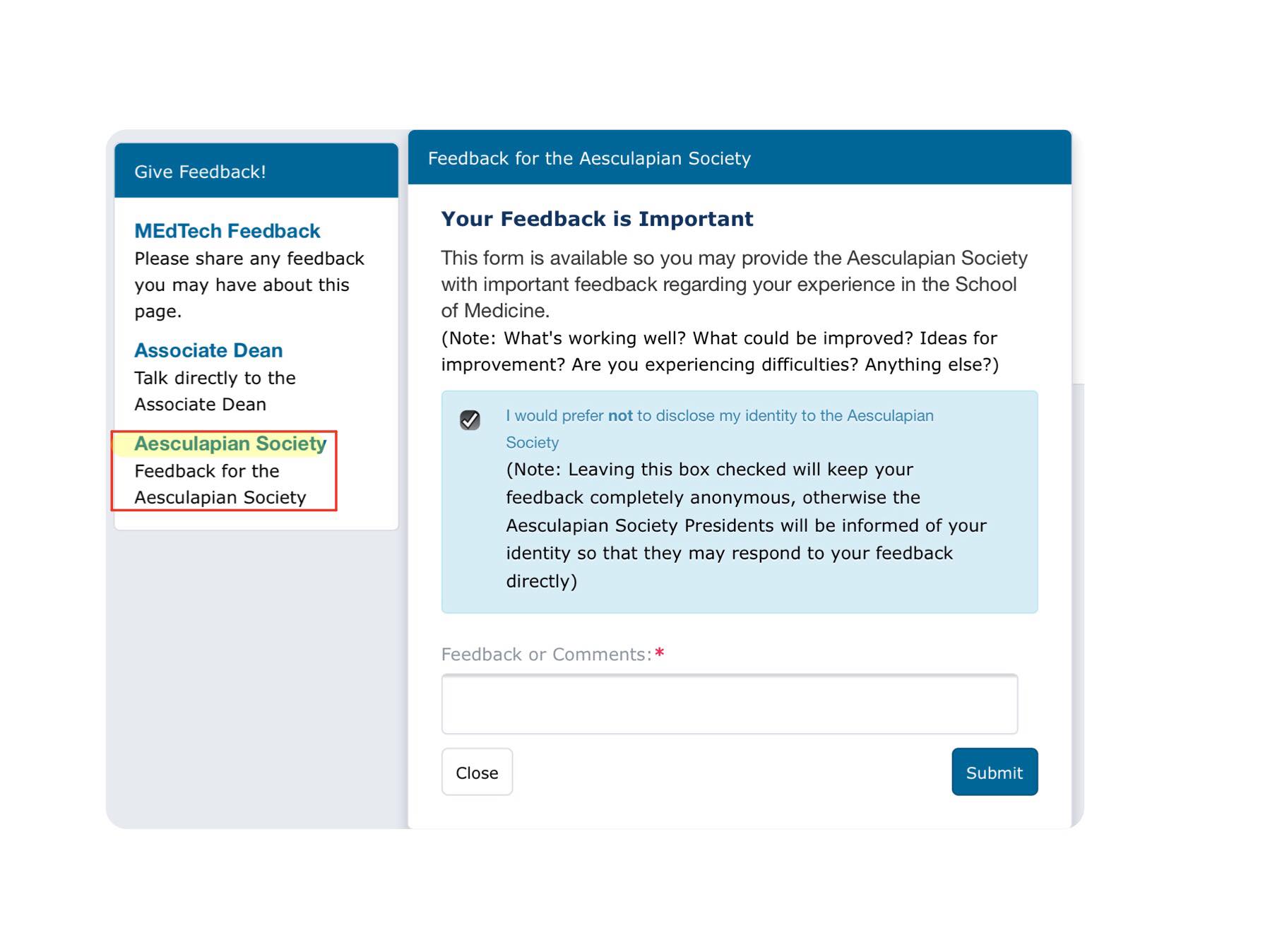 Aesculapian Society confidential feedback: